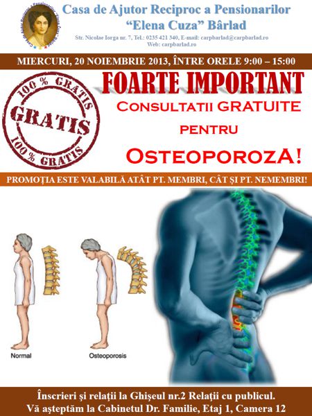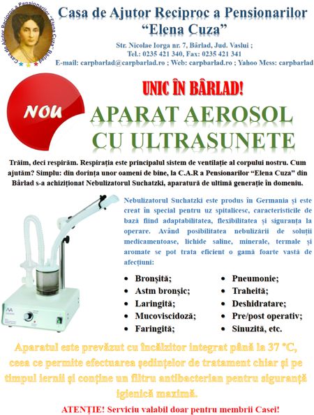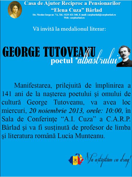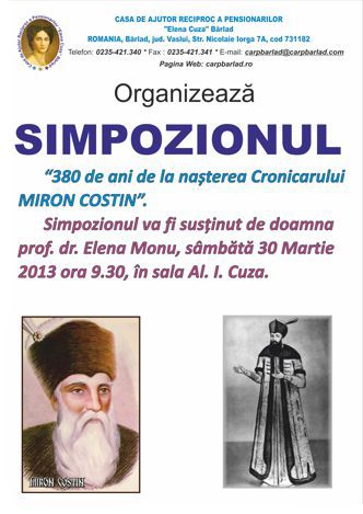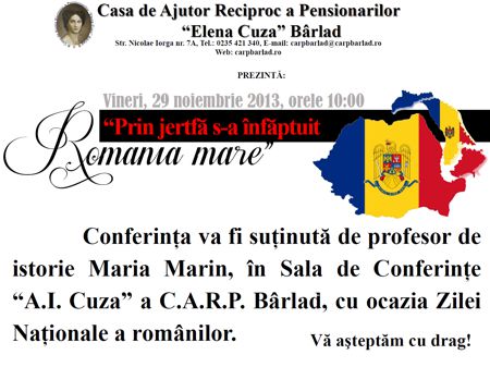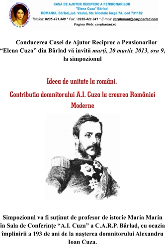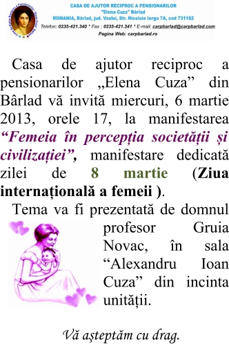 Casa de ajutor reciproc a pensionarilor „Elena Cuza” din Bârlad vă invită miercuri, 6 martie 2013, orele 17, la manifestarea “Femeia în percepția societății și civilizației”, manifestare dedicată zilei de 8 martie (Ziua internațională a femeii ). Tema va fi prezentată de domnul profesor Gruia Novac, în sala “Alexandru Ioan Cuza” din incinta unității. Vă așteptăm cu drag.