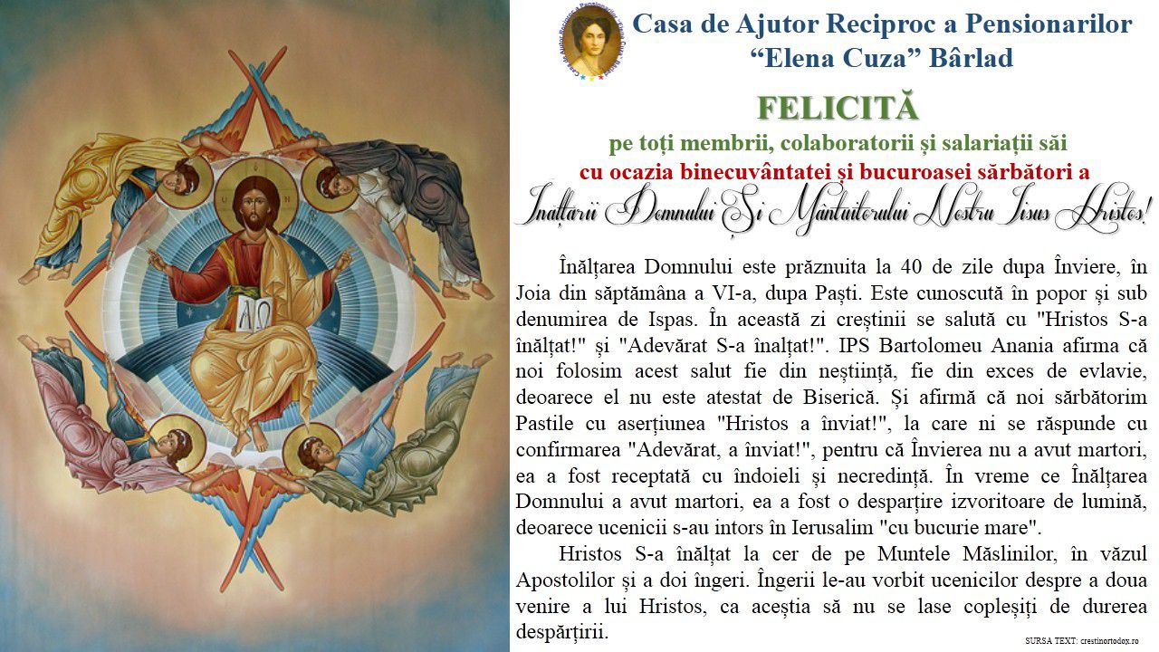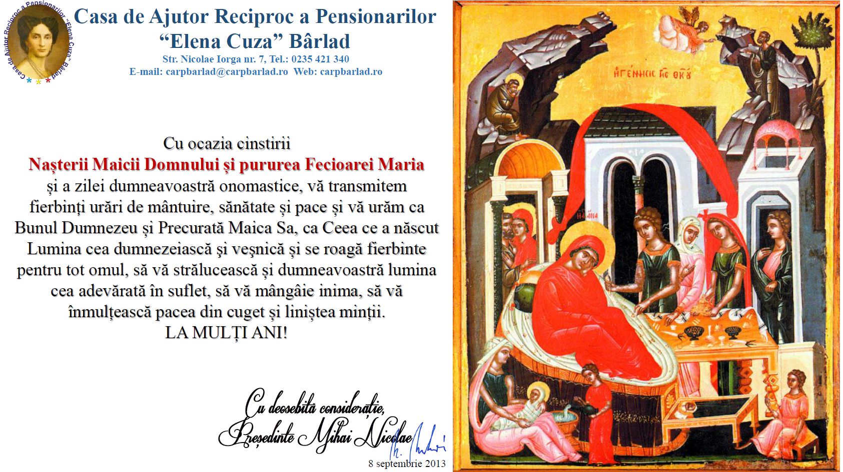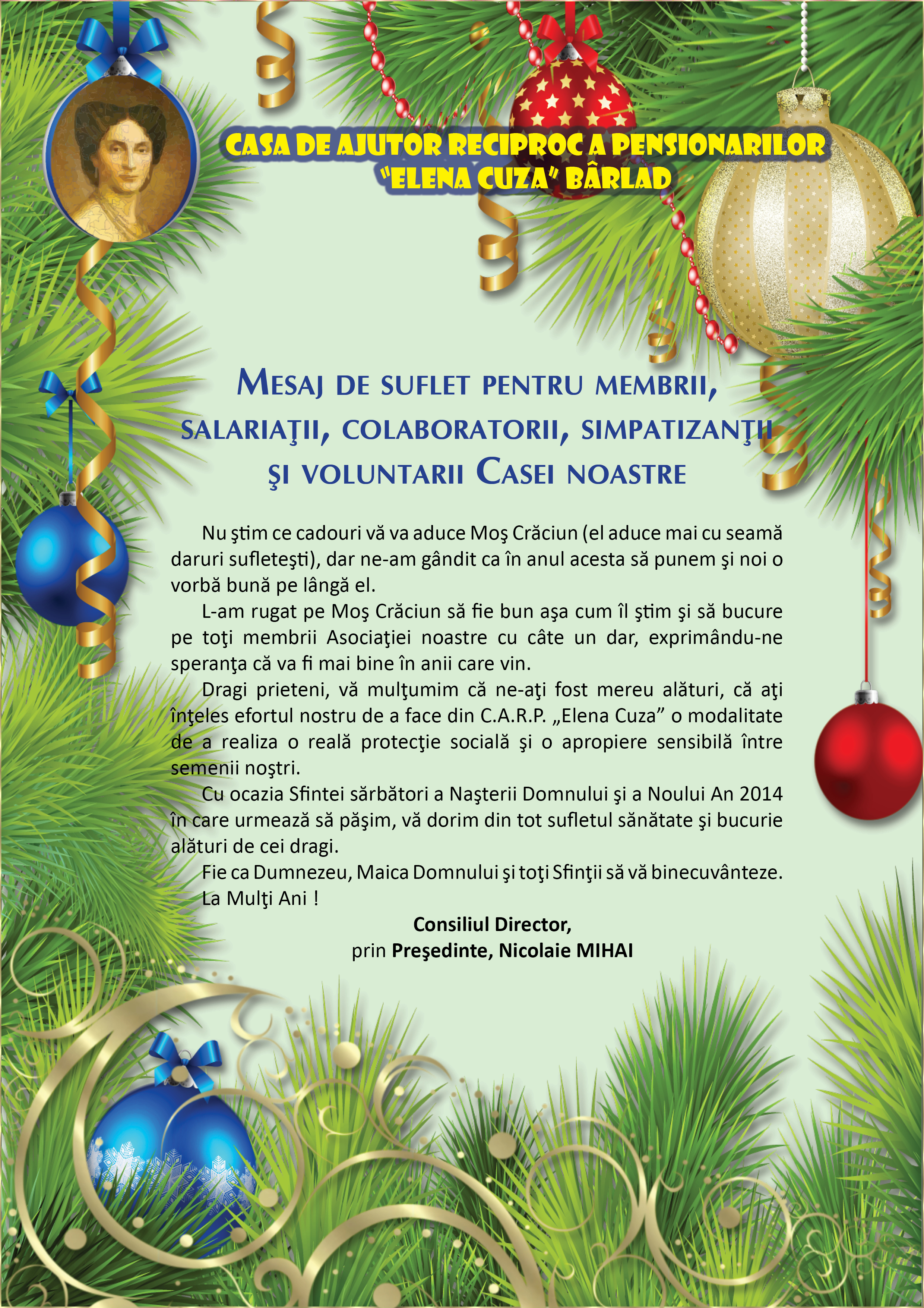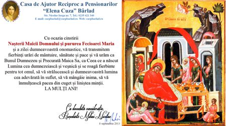 Președintele asociației noastre – domnul Nicolae Mihai și Consiliul Director vă urează cu ocazia venirii primăverii și a zilei de 8 martie, tradiționalul „La mulți ani”, Dumnezeu să vă binecuvinteze și multă sănătate. Ne bucurăm că dintre membrii noștri, o parte însemnată este reprezentată de partea feminină, lucru care ne înfrumusețează viața. Femeia reprezintă sensibilitate și gingășie, dar și realism, de aceea considerăm un atu faptul că asociația noastră este susținută preponderent de membri femei. Ne arătăm recunoștința și stima față de acestea, mai ales că o femeie, pe lângă statutul ei social, este și mamă și soție. Ea naște prunci, îi crește, are grijă de soț - îl spală, îl hrănește, îl suține sentimental și moral - iar în secolul acesta vitezoman, atipic și aproape nenatural, femeia a fost nevoită să și muncescă alături de bărbat, munci care de multe ori presupun pericolul de a deforma însăși feminitatea în sine. Tocmai de aceea, eu personal și noi, toți bărbații din CARP “Elena Cuza” din Bârlad, ne aplecăm cu profundă recunoștință și apreciere către cele care ne fac ziua mai frumoasă - dar și mai ușoară - către cele care prin eforturile, jertfele și dedicarea lor au ajutat Casa noastră să devină una de vârf, membrele noastre! Vă mulțumim că prin existența dumneavostră viețile noastre sunt mai liniștite, mai sensibile, mai bune. De aceea, noi vă urăm ca binecuvântarea Domnului să vă înmiresmeze și mai mult inimile, astfel încât ele să devină adevărate izvoare de blândețe și mângâiere.
