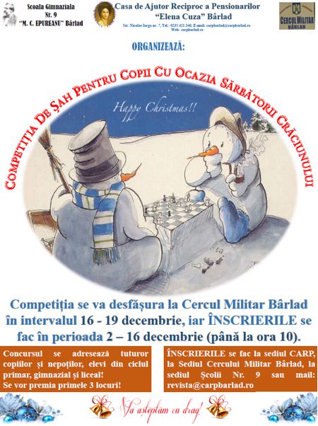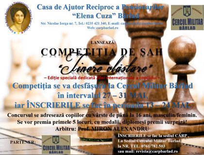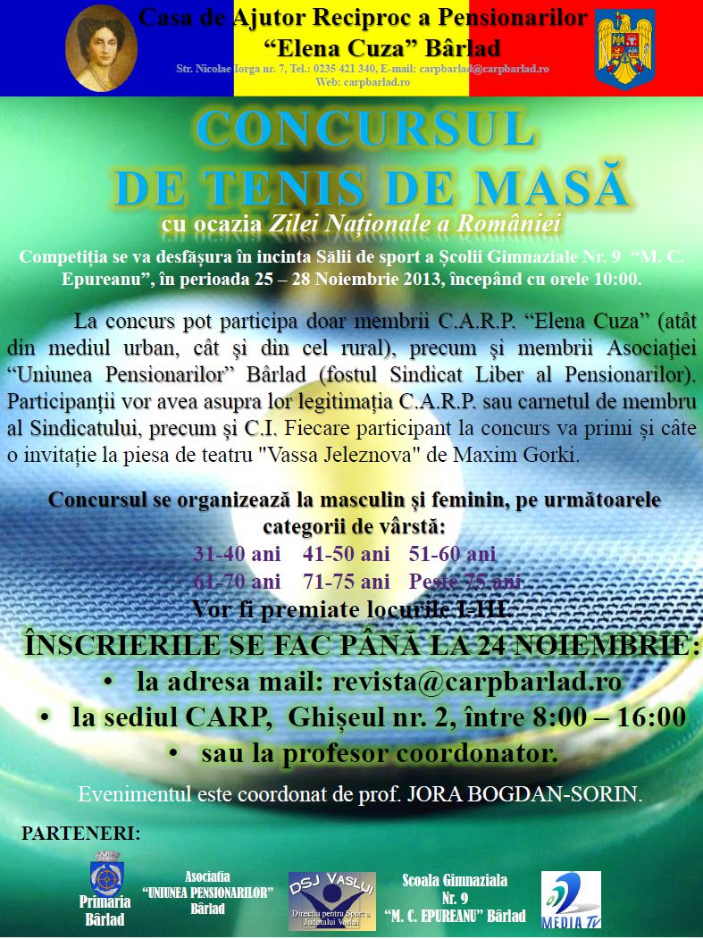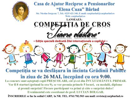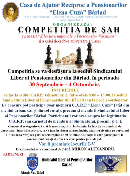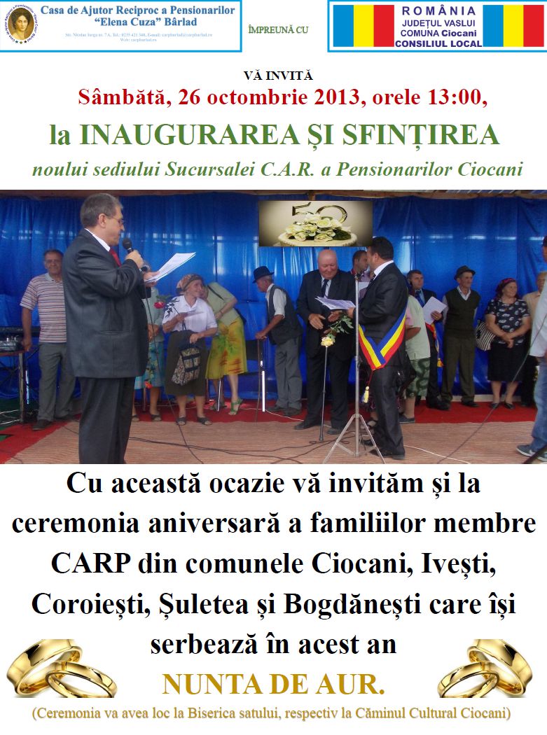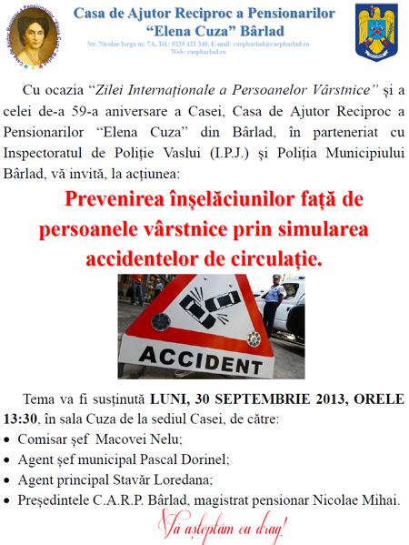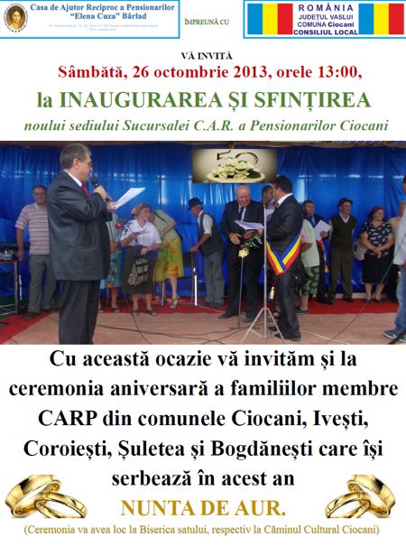 Cu ocazia Zilei Internaționale a Persoanelor Vârstnice (1 Octombrie) și a Zilei Asociației noastre (8 Octombrie) vor fi sărbătorite acele cupluri, membre ale C.A.R.P. "Elena Cuza" Bârlad, care în acest an împlinesc 50 de ani de la căsătorie. Rugăm aceste cupluri să se prezinte în perioada 19 Martie - 30 Septembrie la sediul nostru din Bârlad sau la sediul sucursalelor din teritoriu pentru a fi luate în evidență pe baza următoarelor înscrisuri și documente: carnetul de membru al fiecărui soț, certificatul de căsătorie și B.I. sau C.I. al fiecărui soț.