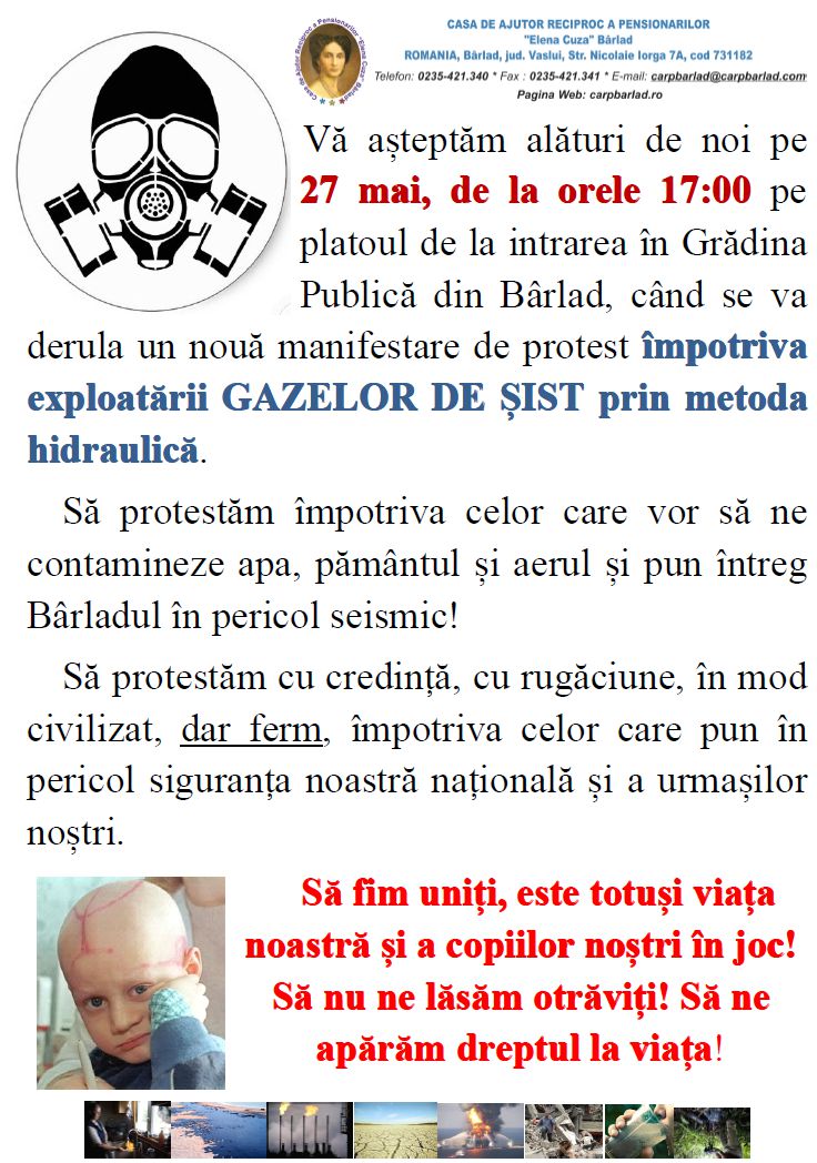 Vă așteptăm alături de noi pe 27 mai, de la orele 17:00 pe platoul de la intrarea în Grădina Publică din Bârlad, cănd se va derula o nouă manifestare de protest împotrivaexploatării GAZELOR DE ȘIST prin metoda hidraulică.