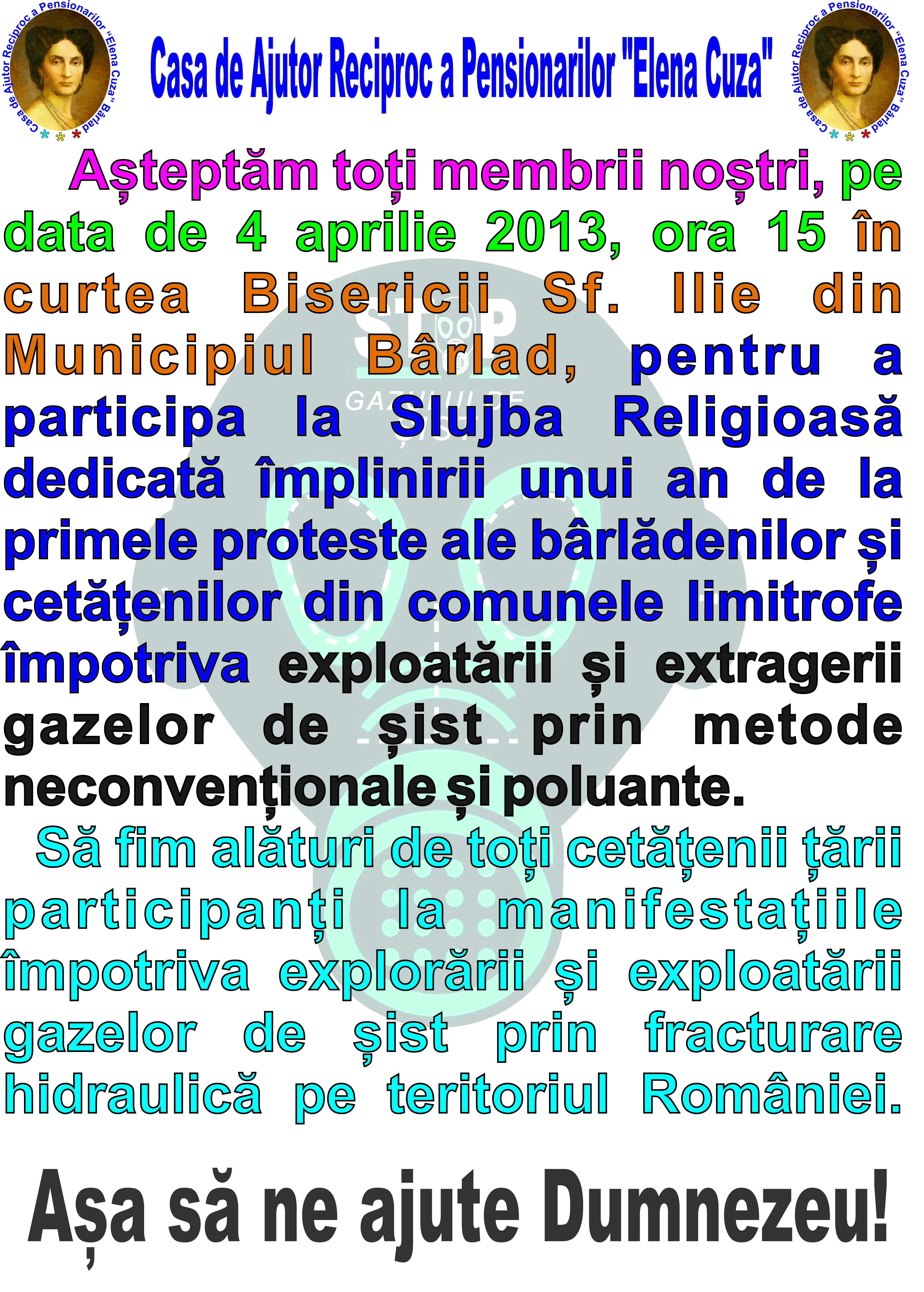 Mesajul CARP „Elena Cuza” Bârlad pentru marșul de protest împotriva exploatării GAZELOR DE ȘIST prin metoda hidraulică, miercuri, 27 februarie 2013 | ||