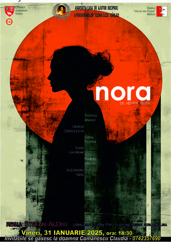 Piesa de teatru ”NORA” este regizată de Stefan Alexiu, bârlădean „mutat” cu teatrul la Bacău. Dacă titlul este NORA, dacă autorul este IBSEN, dacă distribuția si regia sunt excelente, înseamnă că s-au întrunit „ingredientele” potrivite pentru a „ademeni” membrii Asociației la spectacol binemeritat. NORA… dincolo de povestea unei relații de dragoste (abuzivă, pentru că abuzul îmbracă forme diverse), găsim o demonstrație axiomatică a faptului că omul are nevoie de minciună pentru a supraviețui, dar… care e limita, cine o stabilește? Societatea? Prejudecățile? Putem afirma că textul este o critică tăioasă a ipocriziei sociale care uzează viața de familie. Ideologiile strâmbe pot fi depășite, întotdeauna, prin ruperea barierelor: rămâne să aflăm ce va face Nora, femeia captivă între pereții unei existente artificiale. Totuși, cine este Nora? Femeia-copil? Femeia-păpușă? Toate sunt...
