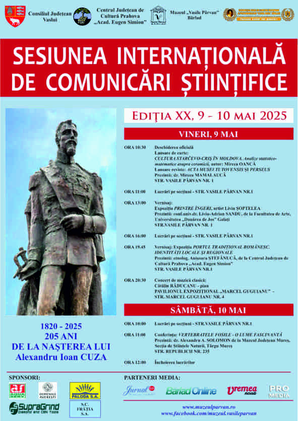 Muzeul „Vasile Parvan” are deosebita plăcere de a vă invita, și în acest an, la o nouă ediție a Sesiunii Internaționale de Comunicări Științifice, eveniment consacrat la nivelul întregii țări și în Republica Moldova. Pe parcursul celor două zile, respectiv, 9 și 10 mai, specialiștii prezenți vor dezbate problematici legate de multiple domenii de cercetare. Astfel, la Secția Arheologie-Istorie organizatorii propun, ca de fiecare dată, două teme: pentru secțiunea preistorie tema: „Noi contribuții în cercetarea preistoriei”, iar pentru perioada primului mileniu creștin, „Arheologia mileniului I p. Chr., la est și vest de Prut”. Secția Științele Universului și ale Vieții propune, de asemenea, două teme, respectiv: „Rezultate importante în astronomia românească” și „Biodiversitate în trecutul geologic”. Secția Personalități Bârlădene și Bibliotecă ne propune temele: „Ce...