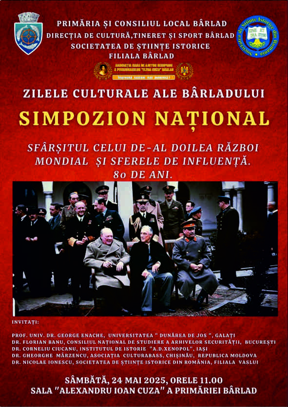 Invită membrii săi la Zilele Culturale ale Bârladului Simpozion Național Sfârșitul celui de-al doilea război mondial și sferele de influență. 80 de ani