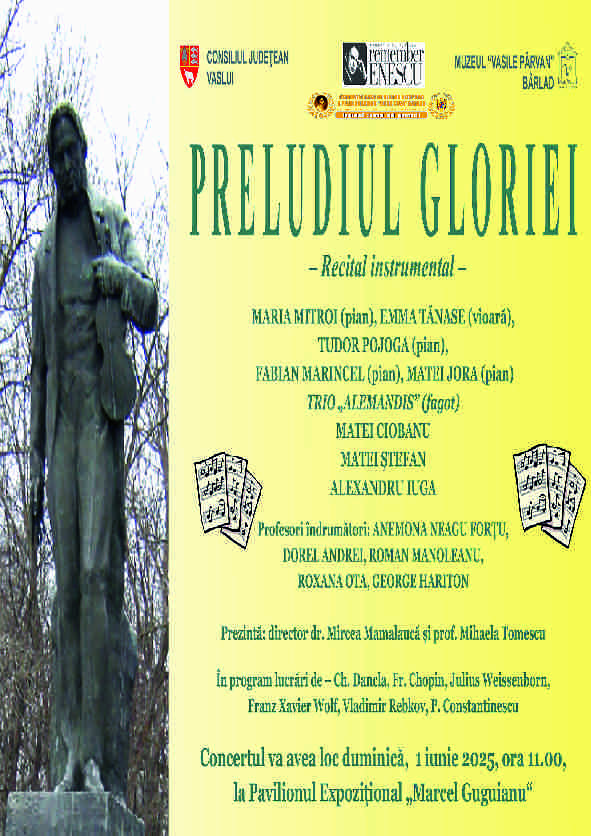 Muzeul „Vasile Pârvan” are plăcerea de a vă invita la ultimul recital din această stagiune, realizat în parteneriat cu Fundația Culturală „Remember Enescu”, sub îndrumarea prof. Mihaela Tomescu. Recitalul va avea loc duminică, 1 iunie, ora 11:00, la Pavilionul Expozițional „Marcel Guguianu” (str. Marcel Guguianu 4–6, Bârlad). Ne vor încânta cu muzica și talentul lor: Maria Mitroi (pian), Emma Tănase (vioară), Tudor Pojoga (pian), Fabian Marincel (pian), Matei Jora (pian), Trio „Alemandis” – fagot: Matei Ciobanu, Matei Ștefan, Alexandru Iuga. În cadrul programului vom audia lucrări de: Vladimir Rebkov, Ch. Dancla, P. Constantinescu, Fr. Chopin, F.Liszt, Julius Weissenborn. “ Participă elevi de la școli și colegii de artă din Bârlad, București, Iași. Profesori îndrumători – ANEMONA NEAGU FORTU, DOREL ANDREI, ROMAN MANOLEANU, ROXANA OTA, GEORGE HARITON. Vă așteptăm cu drag ! ACCESUL ESTE GRATUIT.