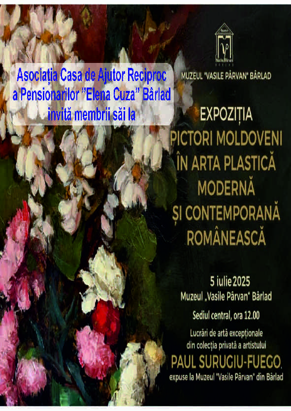 Invită membrii săi la un eveniment de excepție pentru cei care sunt interesați de lucrările de artă importante din colecțiile Muzeului Vasile Pârvan din Bârlad: Lansarea volumului PICTURĂ‚ ROMÂNEASCĂ‚ DIN COLECȚIILE SECȚIEI DE ARTĂ‚ A MUZEULUI "VASILE PÂRVAN" BÂRLAD (1914-2004). Albumul este îngrijit și documentat de regretata doamnă Nicoleta Arnăutu, muzeograf și fost director al Muzeului Vasile Pârvan. Lansarea va avea loc Duminică, 18 mai 2025, ora 11, la sediul principal al Muzeului Vasile Pârvan, str. Vasile Pârvan, nr 1.