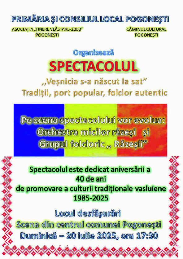 Invităm membrii Asociației, Duminică 20 iulie, orele 17:30, la Spectacolul "Veșnicia s-a născut la sat", dedicat aniversării a 40 de ani de promovare a culturii tradiționale a culturii vasluiene 1985-2025