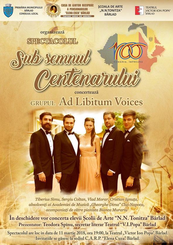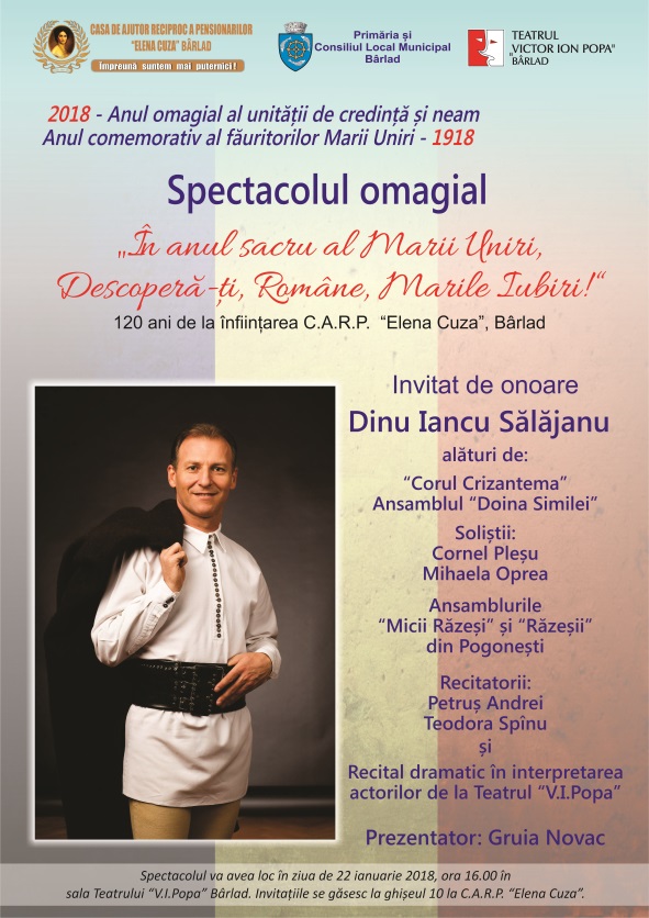 Casa de Ajutor Reciproc a Pensionarilor ,,Elena Cuza’’ Bârlad, alături de Inspectoratul școlar Județean Vaslui, Palatul Copiilor Vaslui și Primăria și Consiliului Local Bârlad vă invită să participați la spectacolul ,,Ca unei ICOANE mă închin Maicii mele, România Mare!’’, pentru a da ton sărbătorilor de iarnă. Evenimentul va avea loc miercuri, 19 decembrie, ora 17:00 la Teatrul ,,Victor Ion Popa’’din Bârlad.
