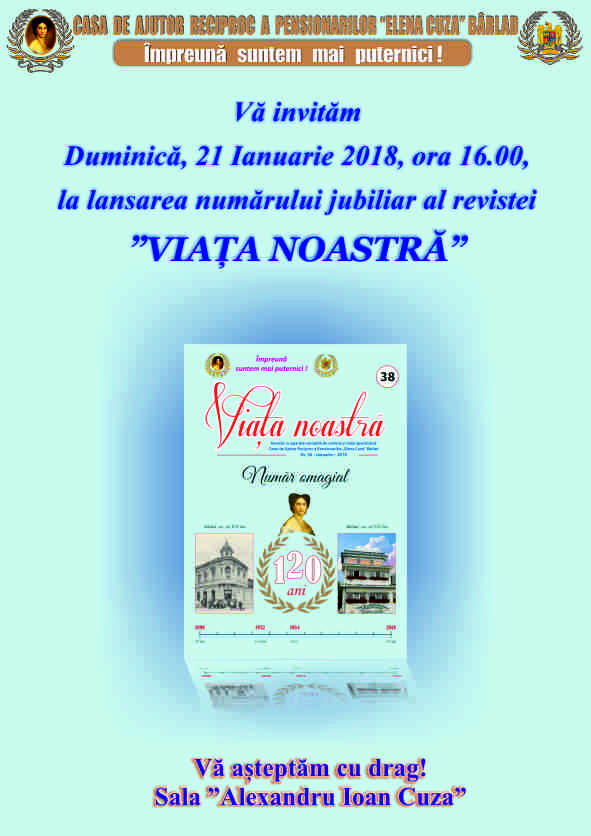 Vă invităm Duminică, 21 Ianuarie 2018, ora 16.00, la lansarea numărului jubiliar al revistei VIAȚA NOASTRĂ Vă așteptăm cu drag! Sala Alexandru Ioan Cuza