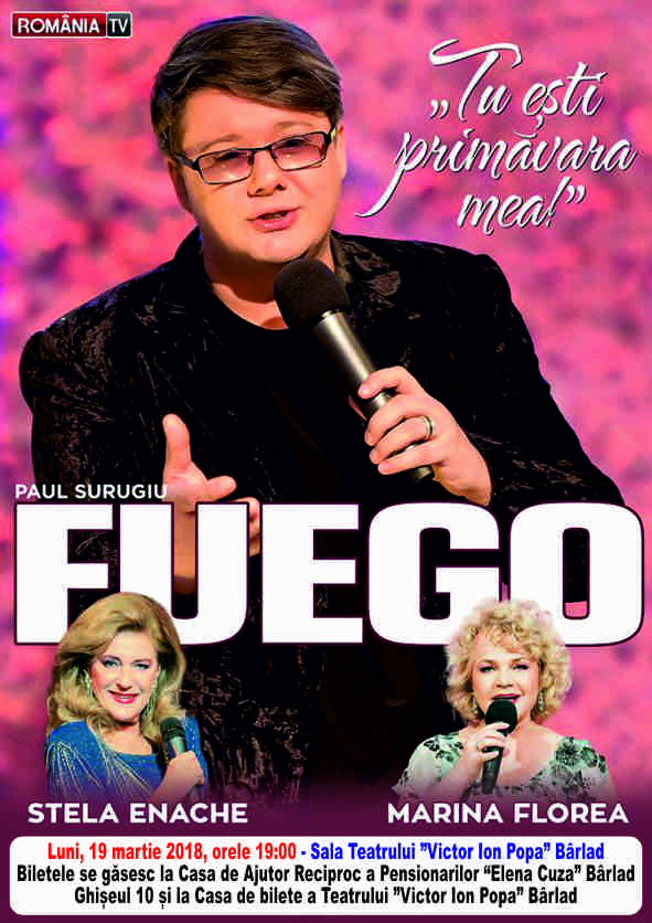 Casa de Ajutor Reciproc â"Elena Cuzaâ" Bârlad vă invită la spectacolul Tu ești primăvara mea!, ce va avea loc luni, 19 martie 2018, ora 19.00 la Teatrul Victor Ion Popa, unde îi veți întâlni pe îndrăgiții interpreți: Paul Surugiu-Fuego, Stela Enache, Marina Florea. Vă Așteptăm cu drag!