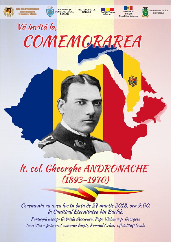 C.A.R.P. "Elena Cuza" Bârlad vă invită la comemorarea lt.col. Gheorghe Andronache. Ceremonia va avea loc marți, 27 martie la Cimitirul "Eternitatea"din Bârlad, începând cu ora 9.00.