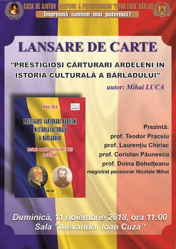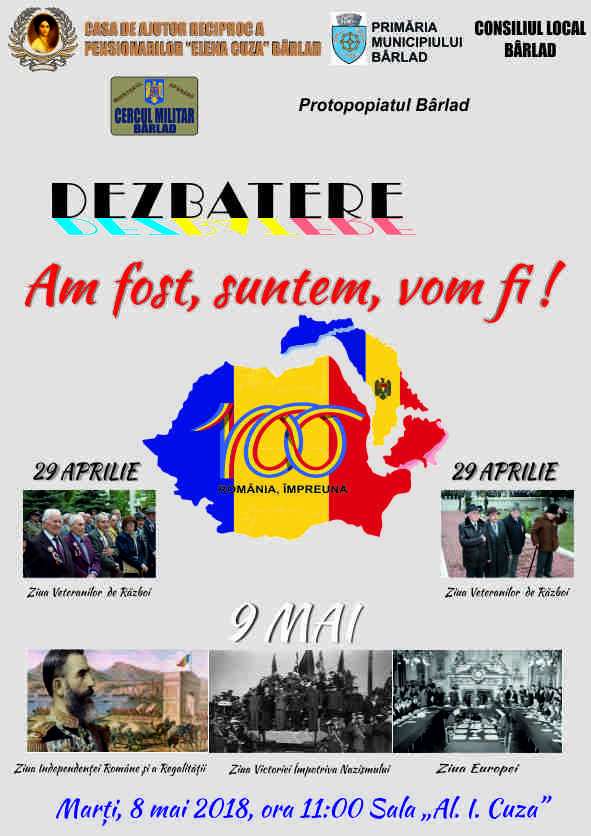 Casa de Ajutor Reciproc a Pensionarilor Elena Cuza Bârlad vă invită la expunerea: Drapelul de luptă-simbol al onoarei și gloriei militare. Evenimentul va avea loc marți, 26 iunie 2018, ora 11.30, în sala Al. I . Cuza.