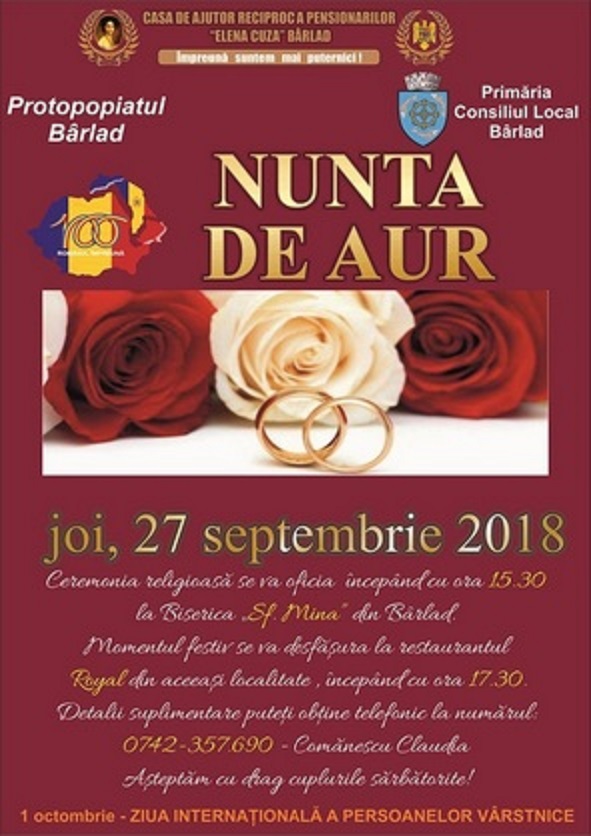 Joi ,27 septembrie 2018, C.A.R.P. "Elena Cuza" din Bârlad își sărbătorește membrii care au împlinit 50 de ani de la căsătorie.Anul acesta ceremonia religioasă se va oficia la Biserica "Sf. Mina" Bârlad, începând cu ora 15.30, iar momentul festiv la restaurantul "Royal", începând cu ora 17.30.