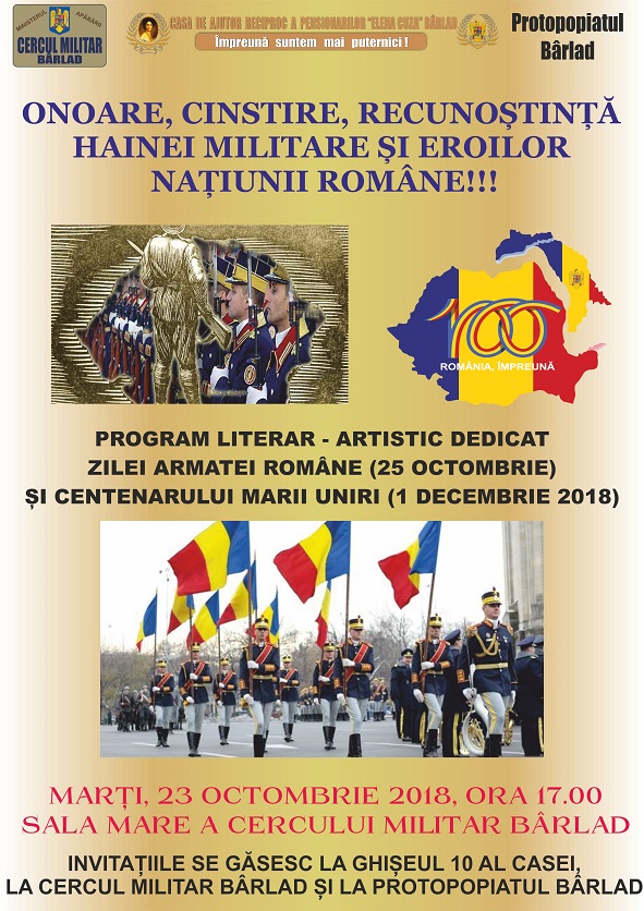 Casa de Ajutor Reciproc a Pensionarilor "Elena Cuza" din Bârlad vă invită la programul artistic-literar "Onoare,Cinstire, Recunoștință Hainei Militare și Eroilor Națiunii Unite!!!", ce se va desfășura în Sala Mare a Cercului Militar Bârlad, marți, 23 octombrie, ora 17.00. Vă așteptăm cu drag!