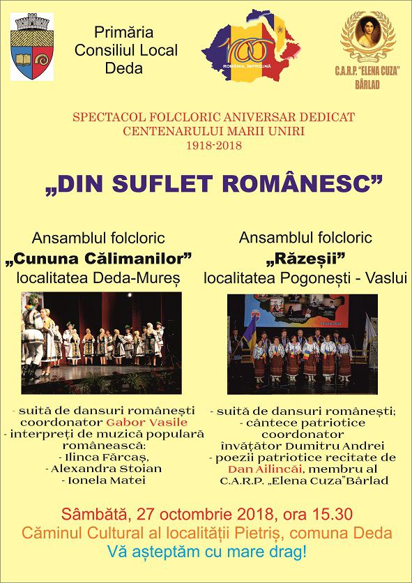 Casa de Ajutor Reciproc a Pensionarilor Elena Cuza din Bârlad vă invită vineri, 27 iulie 2018, ora 11.00 la simpozionul IMNUL-SIMBOLUL UNITĂȚII ȘI IDENTITĂȚII NOASTRE NAȚIONALE