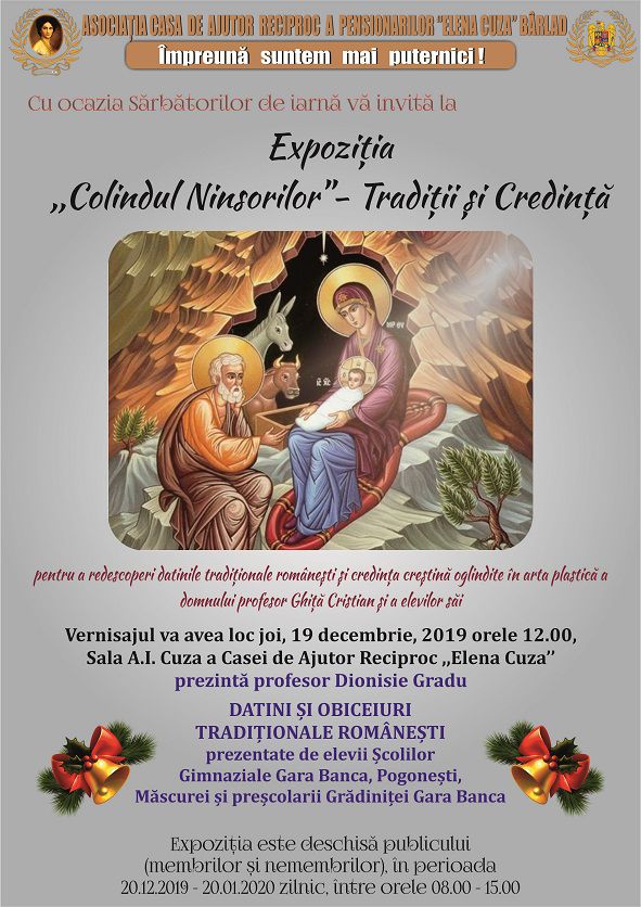 Casa de Ajutor Reciproc a Pensionarilor ,,Elena Cuza’’ din Bârlad vă invită la un eveniment destinat întâmpinării sărbătorilor de iarnă. Este vorba de o expoziție de pictură de icoane a domnului profesor pensionar Ghiță Cristian și lucrări pe pânză ale elevilor pe care acesta i-a pregătit, înfățișând datini și obiceiuri românești din preajma sărbătorilor. Pentru a intra complet în atmosfera Crăciunului, la eveniment vor fi prezenți și elevi ai Școlilor Gimnaziale din Gara Banca, Pogana și Măscurei, alături de micuții preșcolari ai Grădiniței Gara Banca. Sala ,,Al. I. Cuza’’ din incita Casei de Ajutor Reciproc își deschide ușa pentru toți cei interesați să participe la vernisaj, la ora 12:00, în data de 19 decembrie. Menționăm că expoziția va rămâne deschisă până în data de 20 ianuarie 2020. Vă așteptăm cu drag!